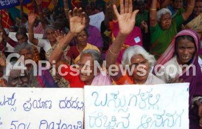 Photo Caption : Members of State Sr Citizens stage a dharna and protesting against Govt and demanding to provide free bus passes to Sr Citizens at MG Statue, in Bangalore on Wednesday 28th Nov 2007