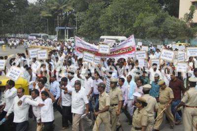 Photo Caption : Karnataka State rural development and panchayatraj department officers and employees association participated in a protest rally from city railway station to freedom park to fulfill their demands, in Bengaluru on Wednesday 17th December 2014
