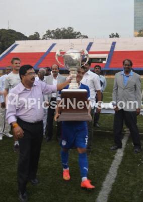 Event Description : Bengaluru Football Club seen with Puttaiah Memorial Cup, celebrate their Victory against Army Service Corps (ASC), as BFC scored 8 Goals and ASC scored 1 respectively, at Bengaluru Football Stadium, in Bengaluru on Saturday 20th December 2014