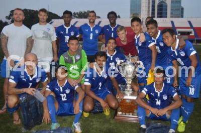 Event Description : Bengaluru Football Club seen with Puttaiah Memorial Cup, celebrate their Victory against Army Service Corps (ASC), as BFC scored 8 Goals and ASC scored 1 respectively, at Bengaluru Football Stadium, in Bengaluru on Saturday 20th December 2014