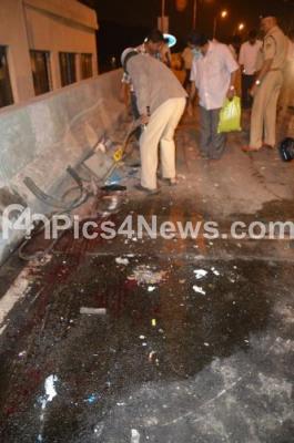 Photo Caption : Police inspecting the Blood stains after a Bus hits Two wheelers killing 4 people, after the driver lost control, at Lingarajpuram, in Bengaluru on Wednesday 24th December 2014