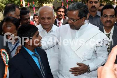 Photo Caption : Chief Minister K Siddaramaiah interacting with Student, during the 22nd National Childrens Science Congress 2014, at SJP Institute of Technology, in Bengaluru on Saturday 27th December 2014