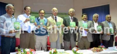 Photo Caption : Dr Ravi with Dr Mohan, Dr Manjunath, Dr Mahadevappa and Dr CS Prakash seen releasing GM Crops, Perception Vs Reality book, at Old Law College, in Bengaluru on Monday 29th December 2014