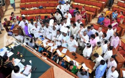 Photo Caption : Congress Councilors protesting with Black bands tied on their hand, during BBMP council meeting at BBMP office, in Bangalore on 31st of December 2014