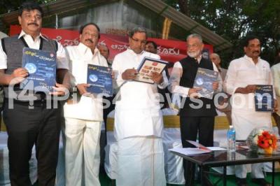 Photo Caption : Chief Minister K Siddaramaiah with Home Minister KJ George information Minister Roshan Baig and PWD Minister HC Mahadevappa and others seen releasing Press Club 2015 Diary, during the 2014 Press Club Award Presentation programme, at Press Club premises, in Bengaluru on Wednesday 31st December 2014