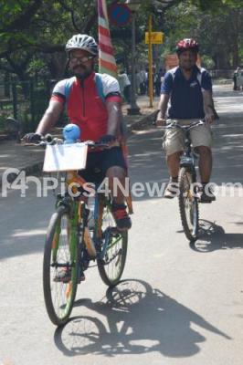 Rakesh Kumar Singh and his colleague partake in a Cyclothon spreading awareness on Gender Freedom, at Press Club, in Bangalore on 3rd of January 2015