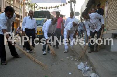 Event Description : Katta Subramanyam Naidu with his supporters seen cleaning, participating in Swacch Bharat Abhiyan, at Ganganagar Bus Stop, RT Nagar, in Bengaluru on Sunday 4th January 2015