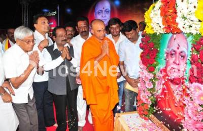 Photo Caption : Nirmalanandanath Mahaswamy with C Somashekhar, Ramachandregowda and others offering tribute o Balagangadharnatha Swamiji, during the Gurusmarana Programme, at Dr BR Ambedkar Playground, in Bengaluru on Tuesday 6th January 2015