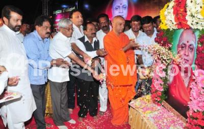 Photo Caption : Nirmalanandanath Mahaswamy with C Somashekhar, Ramachandregowda and others offering tribute o Balagangadharnatha Swamiji, during the Gurusmarana Programme, at Dr BR Ambedkar Playground, in Bengaluru on Tuesday 6th January 2015