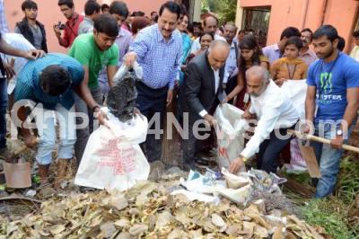 Photo Caption : B Thimmegowda, Vice Chancellor, Bangalore University with staff participate in Swacch Bharath Abhiyaan, at Home Science College, in Bengaluru on Tuesday 13th January 2015