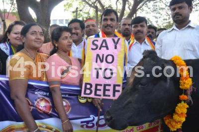 Photo Caption : Members of All India Dr Ambedkar Prachara Samiti participate in a protest rally, demanding the implementation of Cow Slaughter Bill, at SBM Circle, in Bengaluru on Thursday 15th January 2015
