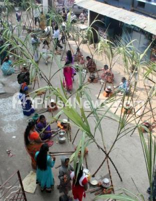 Photo Caption : Women prepared Pongal in a traditional ritual under the sugarcane sticks, celebrating Sankranti Festival, at KS Garden, Sudhamnagar, in Bengaluru on Thursday 15th January 2015