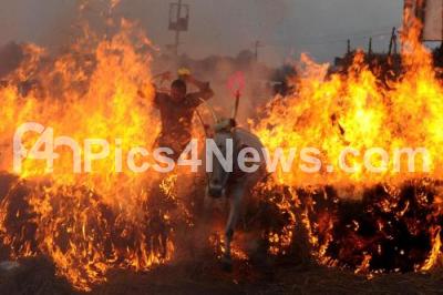 Cows jumping through the fire as a ritual which is being performed from ages as part of the Sankranthi Festival, in Mysuru on Wednesday 15th January 2015
