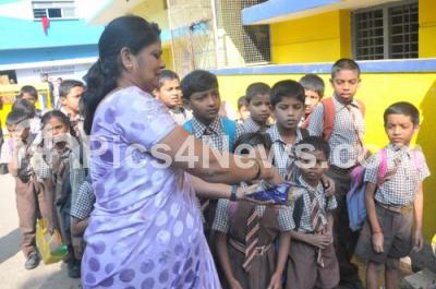 Photo Caption : School Children arrive to attend classes as Venkateshwara School reopens after Molestation case of 8 year old by Physical Training Instructor, at Old Guddadahalli in Bengaluru on Monday 19th January 2015
