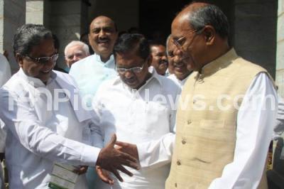 Photo Caption : K Siddaramaiah, Chief Minister with KPCC President and MLC G Parmeshwar greeting AICC General Secretary Digvijaya Singh after their meeting, at Kumarkrupa Guest House, in Bengaluru on Saturday 24th January 2015