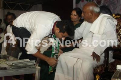 Photo Caption : Prajwal Gowda, son of HD Revanna taking blessings from his grandfather, during the JDs Meeting with State Level Office bearers, Leaders and Workers Meeting, at Gayatri Vihar, Palace Grounds, in Bengaluru on Saturday 24th January 2015