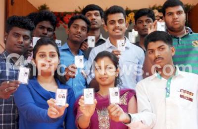 Photo Caption : New Voters display the Election Identification Cards, during the National Voters Day Celebrations, organized by Election commissioner of India, at Jnana Jyothi Auditorium, in Bangalore on 25th of January 2015