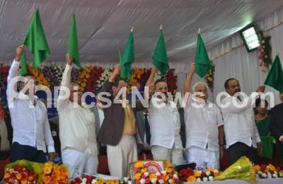 Event Description : Suresh Prabhakar Prabhu, Union Railway Minister with DV Sadananda Gowda, Union Law Minister, PC Mohan, MP, RV Deshpande, Tourism Minister, Dinesh Gundu Rao, Minister, Ramlinga Reddy, Transport Minister flagged off four trains, Yeshwantpur to Katra, Patna to Bengaluru, Kamakhya to Bengaluru and Tatanagar to Yeshwantpur ( Baiyyappanahalli) during a program at Bangalore City Railway Station, in Bengaluru on Thursday 29th January 2015