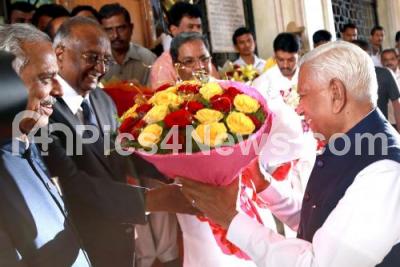 Photo Caption : Governor Vajubhai Rudabhai Vala being welcomed by CM Siddarmaiah with Assembly Speaker Kagodu Thimmappa and Council Chairman DH Shankarmurthy during joint session at Assembly, in Bengaluru on Tuesday 2nd February 2015