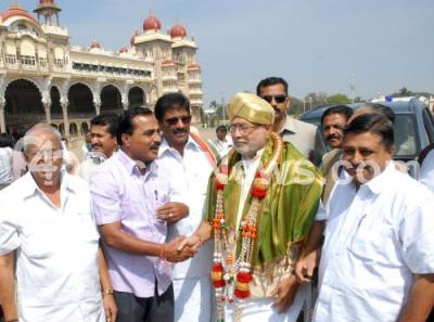 Photo Caption : Prahlad modi, brother of Prime Minister Narendra Modi, being welcomed by E. Maruthi Rao Pawar, BJP City Unit President during his visit to Mysore Palace, in Mysuru on Tuesday 2nd February 2015