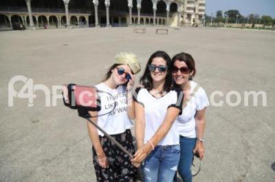 Event Description : Foreign visitors seen taking a selfie in the backdrop of scenic Mysore palace, in Mysuru on Tuesday 2nd February 2015