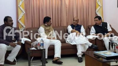 Photo Caption : Rajnath Singh, union minister seen interacting with Prahallad Joshi, BJP state president, R Ashok, BJP leader and Satish Reddy, MLA during their meet at HAL airport, in Bengaluru on Tuesday 2nd February 2015