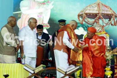 Photo Caption : Governor Vajubhai Vala being felicitated by Shivamurthy Shivacharya Swamiji of Taralabalu Mutt in the presence of BS Yedduyurappa during the Taralabalu Hunnime Mahotsava at Channagiri in Davangere district, on Wednesday 4th February 2015