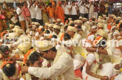 Photo Caption : Grooms seen tying the Mangala Sutra to their brides at the mass marriage program at Banashankari Temple, in Bengaluru on Thursday 5th February 2015