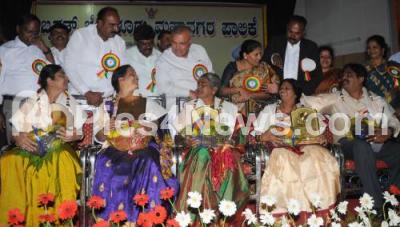 Photo Caption : Ramalinga Reddy, transport Minister and Shathakumari, Mayor presented awards during the Guruvandana and prize distribution program at Shikshakara Sadan, in Bengaluru on Friday 6th February 2015