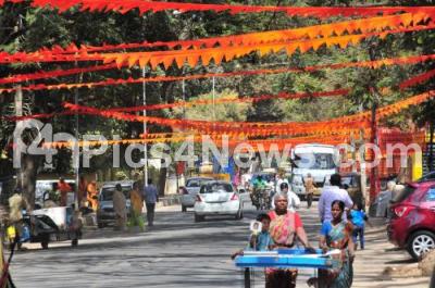 Photo Caption : Stage being set for the Virat Hindu Samajothsava to be held tomorrow on Sunday, organised by Vishwa Hindu Parishad at National College Ground, in Bengaluru on Saturday 7th February 2015