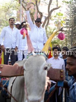 Photo Caption : Members of Kannada Chaluvali Vatal Paksha and its President Vatal Nagaraj protesting with bullock cart from SBM circle to Kempegowda Bus Stand against hike of bus fares , in Bangalore on 8th of February 2015