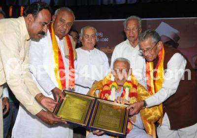 Photo Caption : Former PM HD Devegowda presenting Kengal Hanumantaiah award to Freedom Fighter HS Doreswamy at Kannada Sahitya Parishat, also seen are Former Union Minister MV Rajashekaran and others, in Bangalore on Sunday 8th February 2015