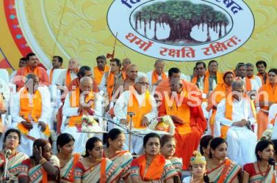 Photo Caption : RSS Sarakaryavaha Bhayyaji Suresh Joshi and G Raghava Reddy, VHP President, Veerendra Heggade, and others at the Virat Hindu Samajotsava by Vishwa Hindu Parishad at National College Grounds, in Bangalore on Sunday 8th February 2015