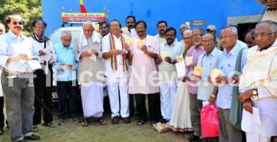 Photo Caption : Freedom fighter HS Doreswamy with Former President, Kannada Sahitya Parishat Dr Nallur Prasad, Jnanpeeta awardee Dr Chandrashekar Kambar, Film Director Nagatihalli Chandrashekar, Prof Chandrashekar Patil, Dr L Hanumantaiah, Mukyamantri Chandru and others at the inauguration of Kannada Nudi Kannada Gadi Jagruti program at Freedom Park, in Bengaluru on Monday 9th February 2015