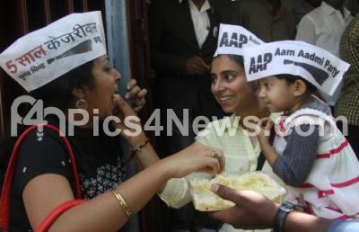 Event Description : AAP members treating each other with sweets in celebration for the AAP victory in Delhi elections, the celebrations were seen at the AAP party office in Bangalore on Tuesday 10th February 2015