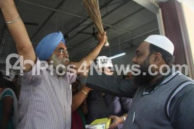 AAP members treating each other with sweets in celebration for the AAP victory in Delhi elections, the celebrations were seen at the AAP party office in Bangalore on Tuesday 10th February 2015