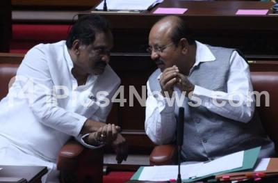 Photo Caption : KJ George, Home Minister seen interacting with TB Jayachandra, Law Minister during the Council Session at Vidhan Soudha, in Bengaluru on Thursday 12th February 2015