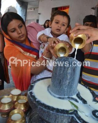 Photo Caption : Devotees performing milk abhisheka to shivalinga at Shiva Temple, old airport road, on the occasion of Mahashivaratri Festival, in Bengaluru on Tuesday 17th February 2015