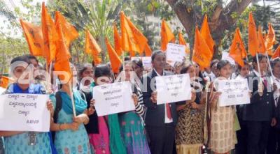 Members of ABVP protesting and demanding full fill their various demands at Central College premises, in Bengaluru on Friday 20th February 2015