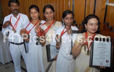 Photo Caption : Jubilant students, who bagged two gold medals each showing off their medals during the 15th Annual Convocation of KSOU held at Kalamandira, in Mysuru on Thursday 5th March 2015