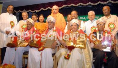 Photo Caption : Sri Shivaratri Deshikendra Mahaswamiji presented "Samskruti Sangama" award to Go Ru Channabasappa, Pamashree Bannanje Govindacharya, Dr HJ Lakkappagowda and HR Leelvati at the inauguration of “Sarva Mangala Sahitya Seva Pratistana†at Bharatiya Vidya Bhavan, also seen are Jnanapeeta Awardee Nadoja Dr Chandrashekar Kambar, Former Union Minister MV Rajashekaran, Dr Mallepuram G Venkatesh, Dr C Somashekar, , in Bengaluru on Thursday 5th March 2015