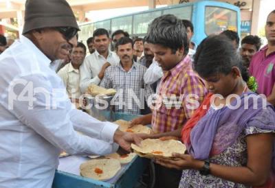 Photo Caption : Vattal Nagaraj seen selling Jowar roti, a unique way of protesting for development works for North Karnataka at Kempegowda bus stand, in Bengaluru on Tuesday 10th March 2015
