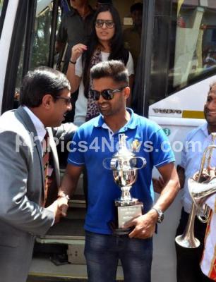 Photo Caption : Vinay Kumar, skipper of victorious Karnataka Ranji Cricket Team arriving at the felicitation program organized by KSCA at M Chinnaswamy Stadium, the Karnataka team arrived from Mumbai after playing their finals match against Tamil Nadu, on their arrival the team got grand welcome from the KSCA officials, in Bengaluru on Friday 13th March 2015