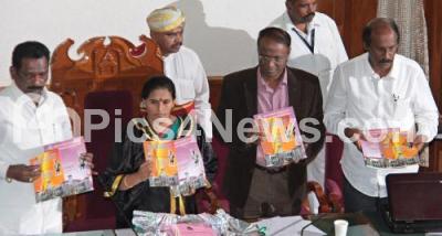 Photo Caption : Shanthakumari, Mayor BBMP with V Anand, Finance and Tax Standing Committee Chairman releasing the BBMP Budget Estimates book for the year 2015 and 16 during the BBMP Budget session at council meeting hall at BBMP office, in Bengaluru on Tuesday 17th March 2015