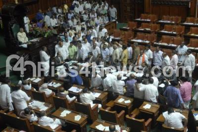 Photo Caption : Opposition leaders demanding the DK Ravi, IAS, suspected death case to be given to CBI during the Assembly Session at Vidhan Soudha, in Bengaluru on Tuesday 17th March 2015