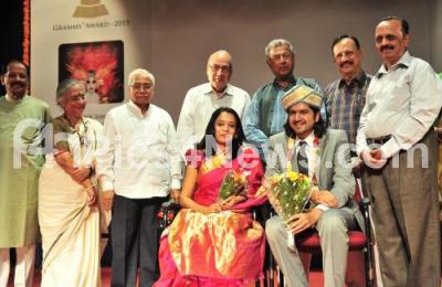 Event Description : Grammy award winner Ricky Kej being felicitated by Chandrashekhar Kambar, Girish Karnad, B Jayashree and others at Gayana Samaj, organised by Gayana Samaj, in Bangalore on Sunday 22nd March 2015