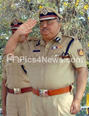 Photo Caption : DG and IGP Om Prakash receiving March past salute during the DGP service parade at Koramangala CRP Grounds, in Bengaluru on Friday 27th March 2015