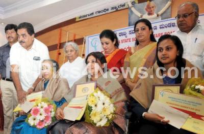 Photo Caption : Forest Minister Ramanath Rai in the presence of Senior Actress Bhavya, Sushilamma, Founder President, Sumnagali Sevashrama and others felicitated Lalita Sahstri, Shanti Desai and Veena, for their achievements in their various fields on the occasion of International Womens Day organized by Karnataka State Social Welfare Board at Gandhi Bhavan, in Bengaluru on Friday 27th March 2015