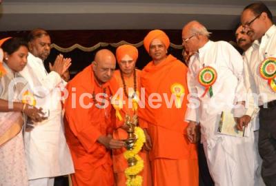 Photo Caption : Minister Anjaneya with Shri Charamurthy Shivarudra Mahaswamy, belimutt, Shri Maachideva Shivayoganandapuri Mahaswamy, Shri Dr Punditaradhya Shivarcharya Mahaswamy, Vidyadhar Guruji, Goru Channabasappa and others inaugurated and released books during the Madiwala Maachideva Jayanthi program at Bharathiya Vidya Bhavan, in Bengaluru on Friday 27th March 2015