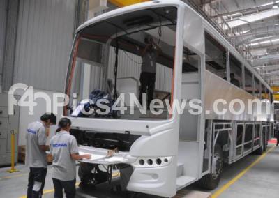 Photo Caption : Scania Bus Factory workers seen working on a new bus during the press conference to announce the inauguration of Scania Bus Factory at Narasapura area, which is on the out Skirts of Bengaluru City, in Bengaluru on Monday 30th March 2015